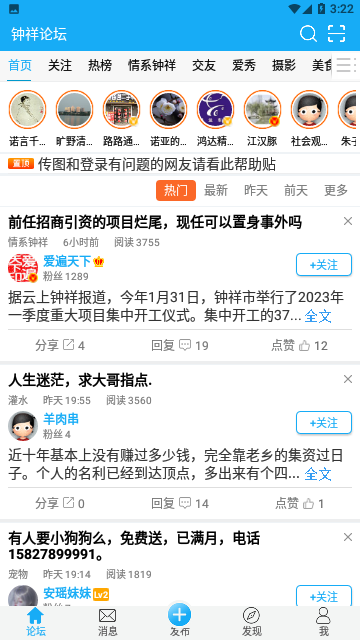 钟祥论坛招聘app这是针对钟祥居民而准备的手机论坛平台,为我们提供了一个交流以及分享的平台,里面有情系钟祥、交友、摄影、美食、游泳、钓鱼、美食、宠物等等聊天板块等着你来参加,快来看看自己感兴趣板块的内容,同时还有教育、文学、招聘、房产、商铺、汽车、装修等等多种板块等着你来发现。