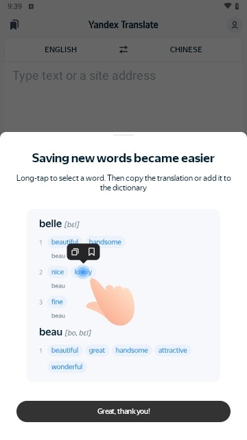 雅虎翻译app是一款涵盖多场景翻译,支持鼠标取词、笔触取词两种灵活模式,鼠标停留或拖动专属“移动笔”即可快速获取译义,搭配单词真人发音,兼顾便捷性与实用性;同时支持段落翻译、网页翻译,输入文本或网页URL即可一键翻译,兼容多种文本格式。此外,内置英汉、汉英、英英、网络解释四种翻译类型,可精准匹配专业词汇与网络热词,自带拼写纠错功能,降低输入失误率。