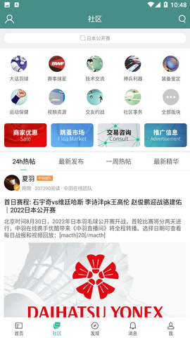 中羽在线app是很多羽毛球爱好者必备的一款关于羽毛球相关赛事以及赛事资讯的平台,更有最新的社区动态以及24小时帖子可以查看,同时在全国之中拥有最火的二手羽毛球的器材可以去交易,还有装备优惠的活动等着我们去参加,我们也可以去表达自己的羽毛球观点,随时都可以聊聊羽毛球的家常。