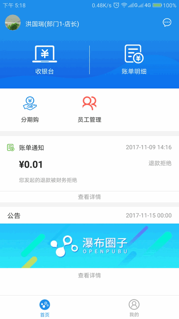 瀑布圈子app这是针对商家而设计的一款经营管理工具,在里面有很多商户的日常运营的效率,里面包含了收银以及账单查询还有员工管理等等常规的功能,还有分期购以及退款申请等等特色服务可以去点击使用,在首页上面就可以查看自己的个人头像信息,只需在头像中就可以查看自己的名字以及相关的部门职位可以查看。