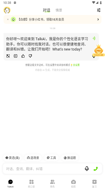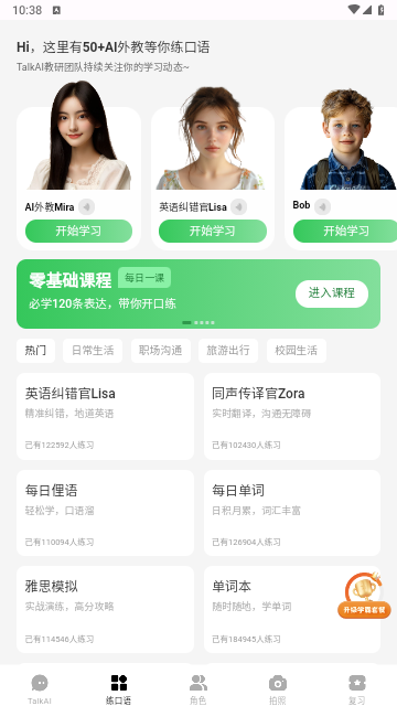 提供了初级、中级、高级三个对话难度,跟踪你的对话水平并实时反馈,帮助你智能实现语言学习目标。