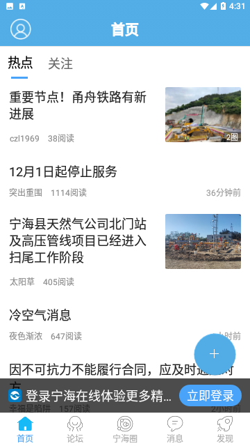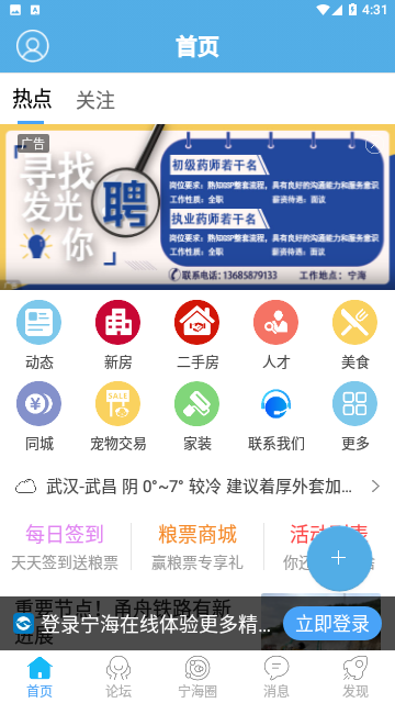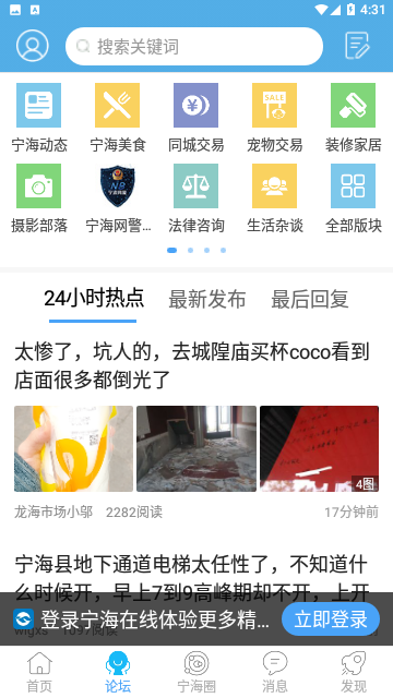 宁海在线app这是一款针对宁海的手机论坛平台,在论坛上有关于宁海本地最新的相关信息以及交流的内容,我们随时都可以在上面去一起去讨论吧,所有的新闻以及资讯都是第一时间实时播报的哦,在上面有动态、新房、二手房、人才、美食、同城、宠物交易、家装、联系我们等等超多功能等你来体验。