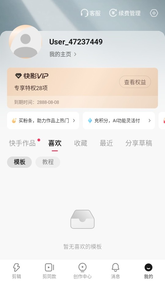 快影破解版app是一款功能十分丰富的影片编辑和制作的工具,在里面提供了很丰富的剪辑工具以及配乐还有特效以及滤镜等等功能可以去使用,还有丰富的字幕的功能可以挑选使用,内置了多种模板以及素材库可以挑选使用,在上面有剪辑、剪同款、创作中心、消息、我的、喜欢、收藏、最近、分享草稿等等功能可以选择。